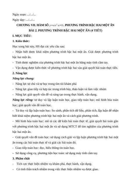 BÀI 2. PHƯƠNG TRÌNH BẬC HAI MỘT ẨN (4 TIẾT) I. MỤC TIÊU: