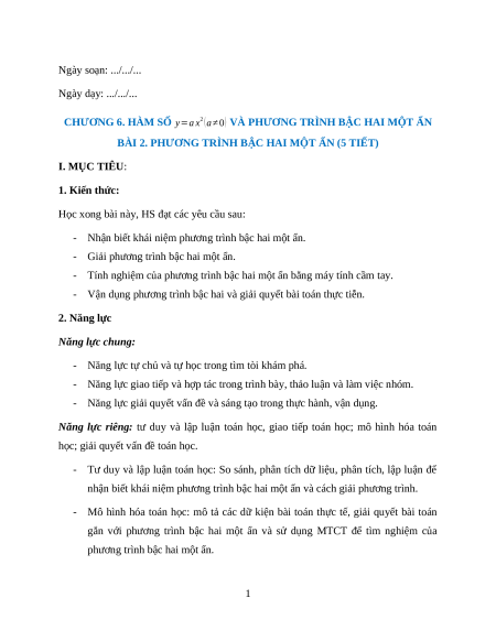 BÀI 2. PHƯƠNG TRÌNH BẬC HAI MỘT ẨN (5 TIẾT) I. MỤC TIÊU: