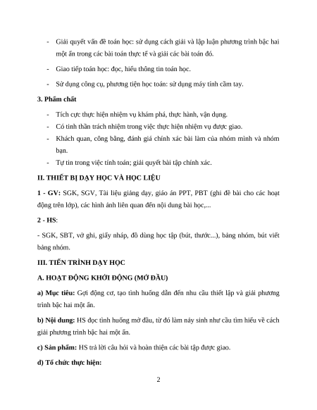 - Vận dụng phương trình bậc hai và giải quyết bài toán thực tiễn. 2. Năng lực