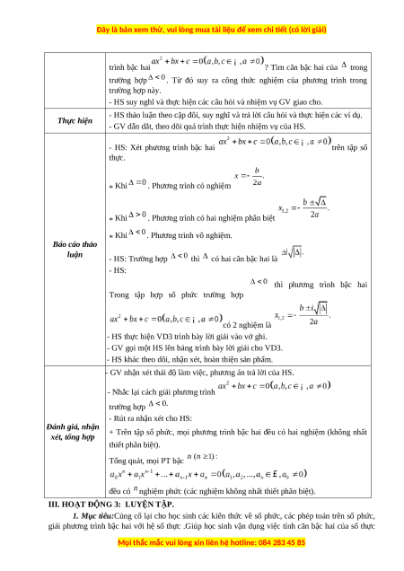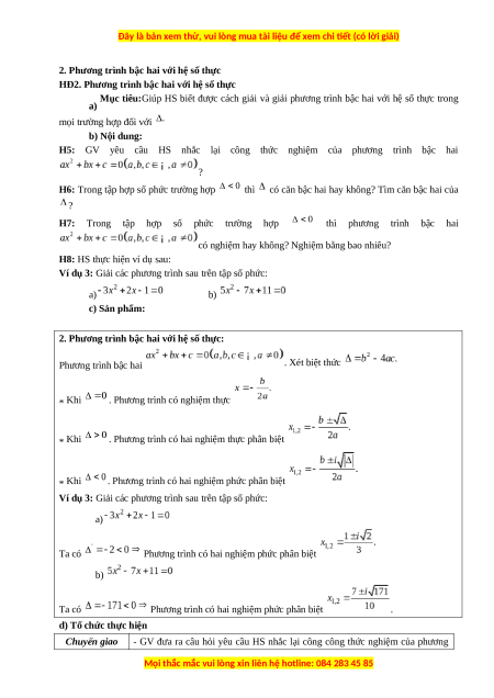 giải phương trình bậc hai với hệ số thực .Giúp học sinh vận dụng việc tính căn bậc hai của số thực