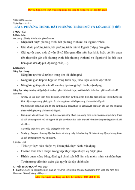 BÀI 4. PHƯƠNG TRÌNH, BẤT PHƯƠNG TRÌNH MŨ VÀ LÔGARIT (3 tiết) I. MỤC TIÊU: 1. Kiến thức: