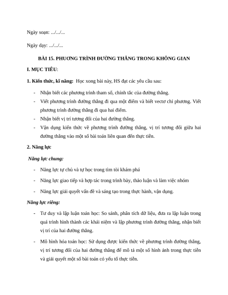 BÀI 15. PHUƠNG TRÌNH ĐƯỜNG THẲNG TRONG KHÔNG GIAN I. MỤC TIÊU: