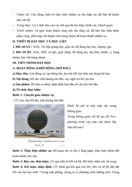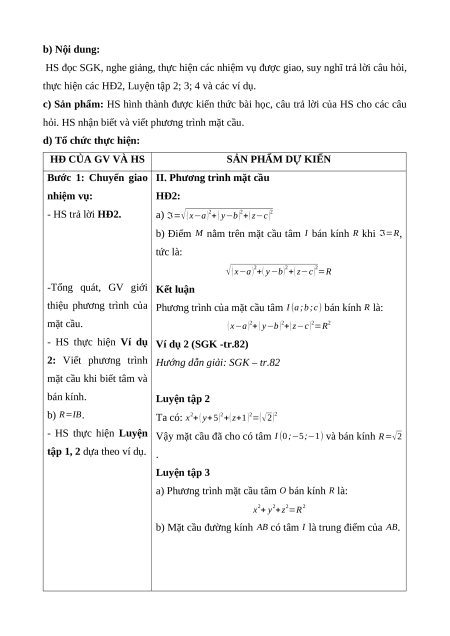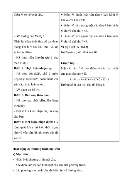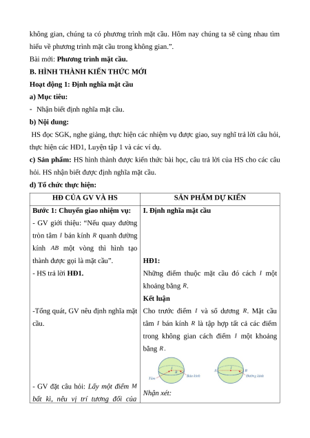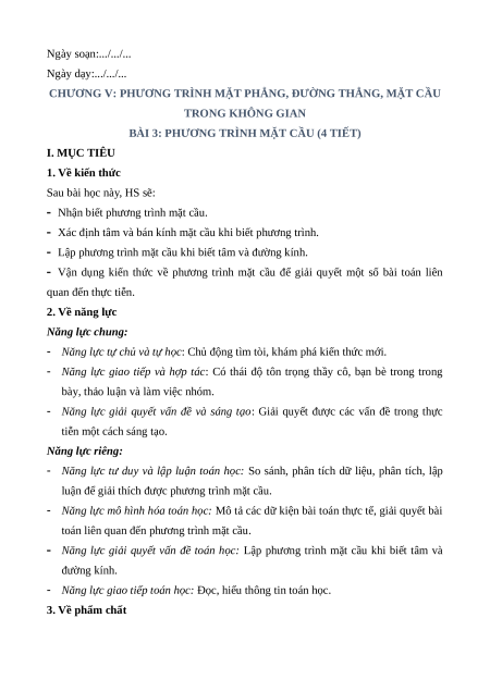 BÀI 3: PHƯƠNG TRÌNH MẶT CẦU (4 TIẾT) I. MỤC TIÊU 1. Về kiến thức Sau bài học này, HS sẽ:
