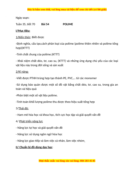 Tuần 35, tiết 70 Bài 54 POLIME I/Mục tiêu: