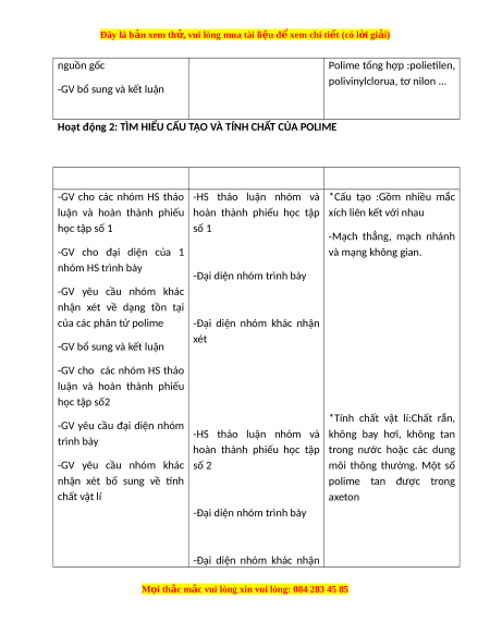 Hoạt động 2: TÌM HIỂU CẤU TẠO VÀ TÍNH CHẤT CỦA POLIME
