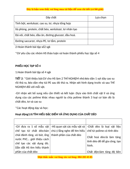 -Một số mẫu vật được chế tạo từ polime: PE, PVC,sợi bông, len lông cừu, sợi tơ