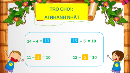 BÀI: 11 TRỪ ĐI MỘT SỐ TRÒ CHƠI: AI NHANH NHẤT 14 – 4 = 10 15 – 5 = 10 17 11 – = 10 1 12 – = 2 10 NỘI DUNG BÀI HỌC