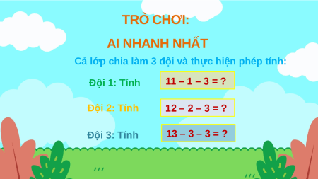 Cả lớp chia làm 3 đội và thực hiện phép tính: Đội 1: Tính 11 – 1 – 3 = ? Đội 2: Tính 12 – 2 – 3 = ? Đội 3: Tính 13 – 3 – 3 = ? BÀI: