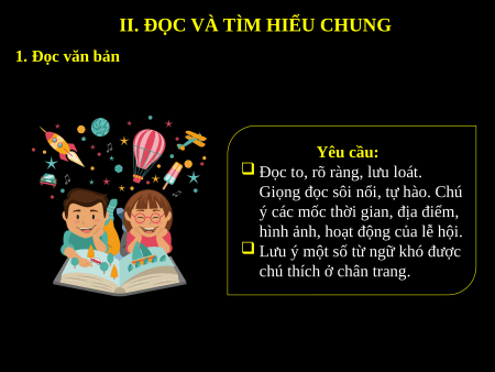 II. ĐỌC VÀ TÌM HIỂU CHUNG 1. Đọc văn bản Yêu cầu: