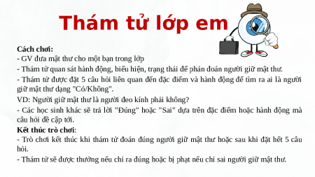 - Trò chơi kết thúc khi thám tử đoán đúng người giữ mật thư hoặc sau khi đặt hết 5 câu hỏi.