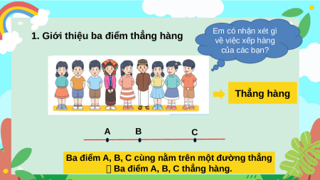 1. Giới thiệu ba điểm thẳng hàng Em có nhận xét gì về việc xếp hàng của các bạn? Thẳng hàng A B C