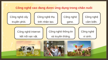 Công nghệ cao đang được ứng dụng trong chăn nuôi Công nghệ cấy Công nghệ thụ Công nghệ Công nghệ truyền phôi. tinh nhân tạo. gene. cảm biến. Công nghệ internet Công nghệ thông tin Công nghệ kết nối vạn vật. và truyền thông. vi sinh.
