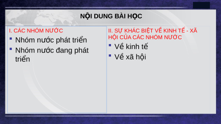 Ủ CÁC NHÓM NƯ C Ớ LOGO N I Ộ DUNG BÀI H C Ọ I. CÁC NHÓM NƯ C Ớ II. S Ự KHÁC BI T Ệ V Ề KINH T Ế - XÃ Nhóm nư c ớ phát tri n ể H I Ộ C A Ủ CÁC NHÓM N C ƯỚ Nhóm nư c ớ đang phát V k ề inh tế tri n ể V x ề ã h i ộ LOGO I. CÁC NHÓM N C ƯỚ Các nư c ớ trên th ế gi i ớ đư c ợ phân chia thành m y ấ nhóm nư c
