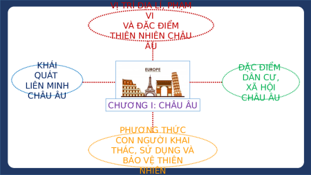 Em hãy chia sẻ những hiểu biết của mình về tự nhiên châu Âu? VỊ TRÍ ĐỊA LÍ, PHẠM VI VÀ ĐẶC ĐIỂM THIÊN NHIÊN CHÂU ÂU KHÁI ĐẶC ĐIỂM QUÁT DÂN CƯ, LIÊN MINH XÃ HỘI CHÂU ÂU CHÂU ÂU CHƯƠNG I: CHÂU ÂU PHƯƠNG THỨC CON NGƯỜI KHAI THÁC, SỬ DỤNG VÀ BẢO VỆ THIÊN NHIÊN TRƯỜNG THCS………….. BÀI 1: