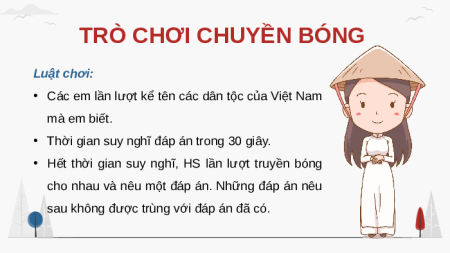 • Các em lần lượt kể tên các dân tộc của Việt Nam mà em biết.