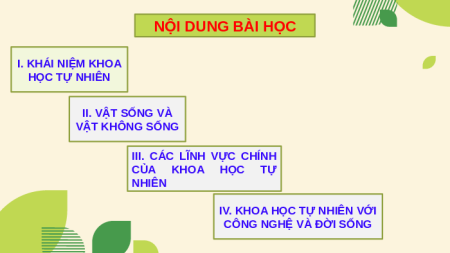 sống của con người sẽ như thế nào? BÀI 1: GIỚI THIỆU VỀ KHOA HỌC TỰ NHIÊN NỘI DUNG BÀI HỌC I. KHÁI NIỆM KHOA HỌC TỰ NHIÊN II. VẬT SỐNG VÀ VẬT KHÔNG SỐNG