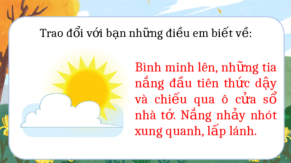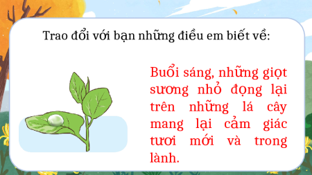 Thứ … ngày … tháng … năm … KHỞI 01 ĐỘNG Trao đ i ổ v i ớ b n ạ nh ng ữ đi u ề em bi t ế v : ề Trao đ i ổ v i ớ b n ạ nh ng ữ đi u ề em bi t ế v : ề Buổi sáng, nh ng ữ gi t ọ s ng ươ nh ỏ đ ng ọ l i ạ trên nh ng ữ lá cây mang l i ạ c m ả giác t i ươ m i ớ và trong lành.