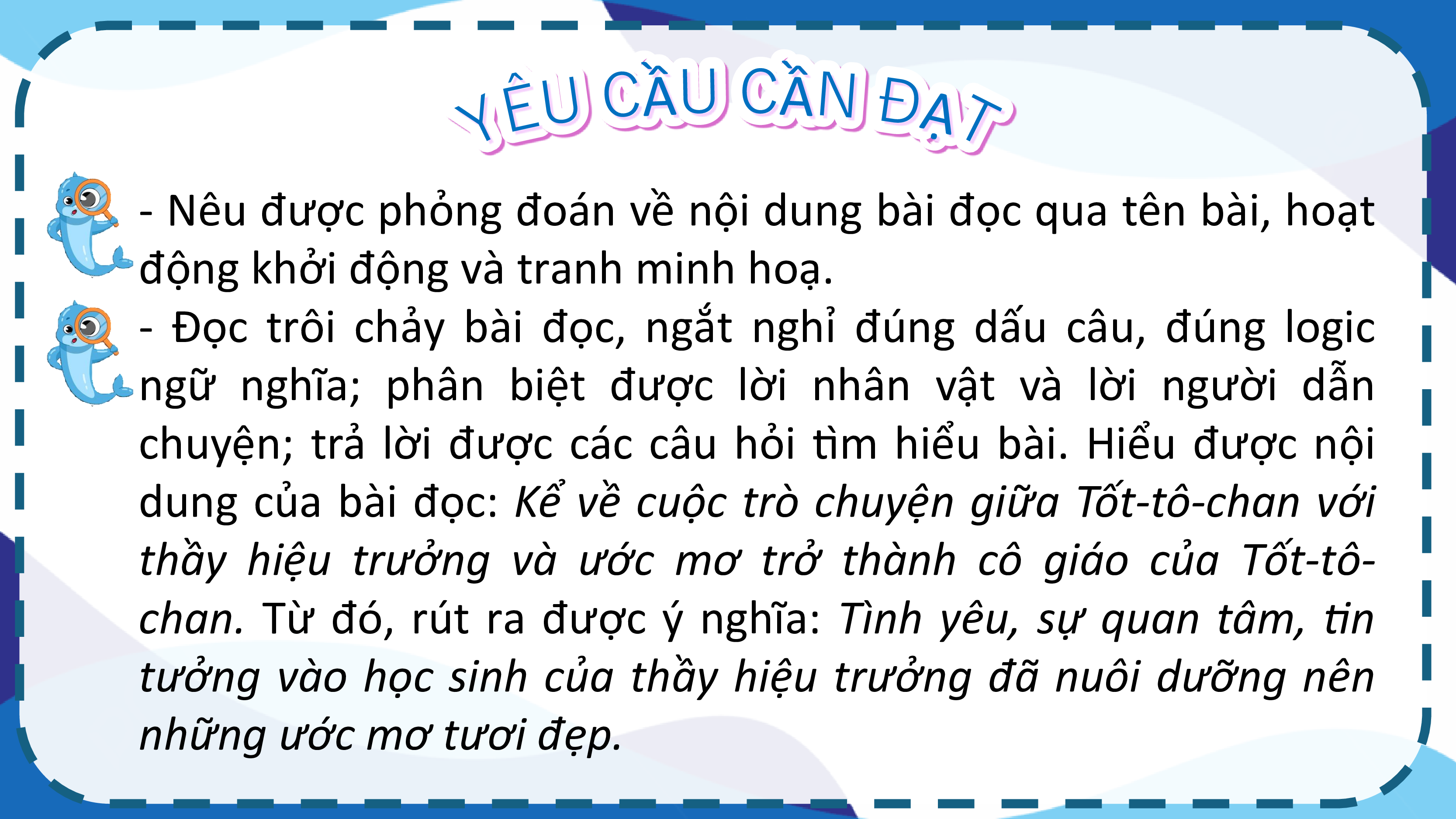 - Đọc trôi chảy bài đọc, ngắt nghỉ đúng dấu câu, đúng logic
