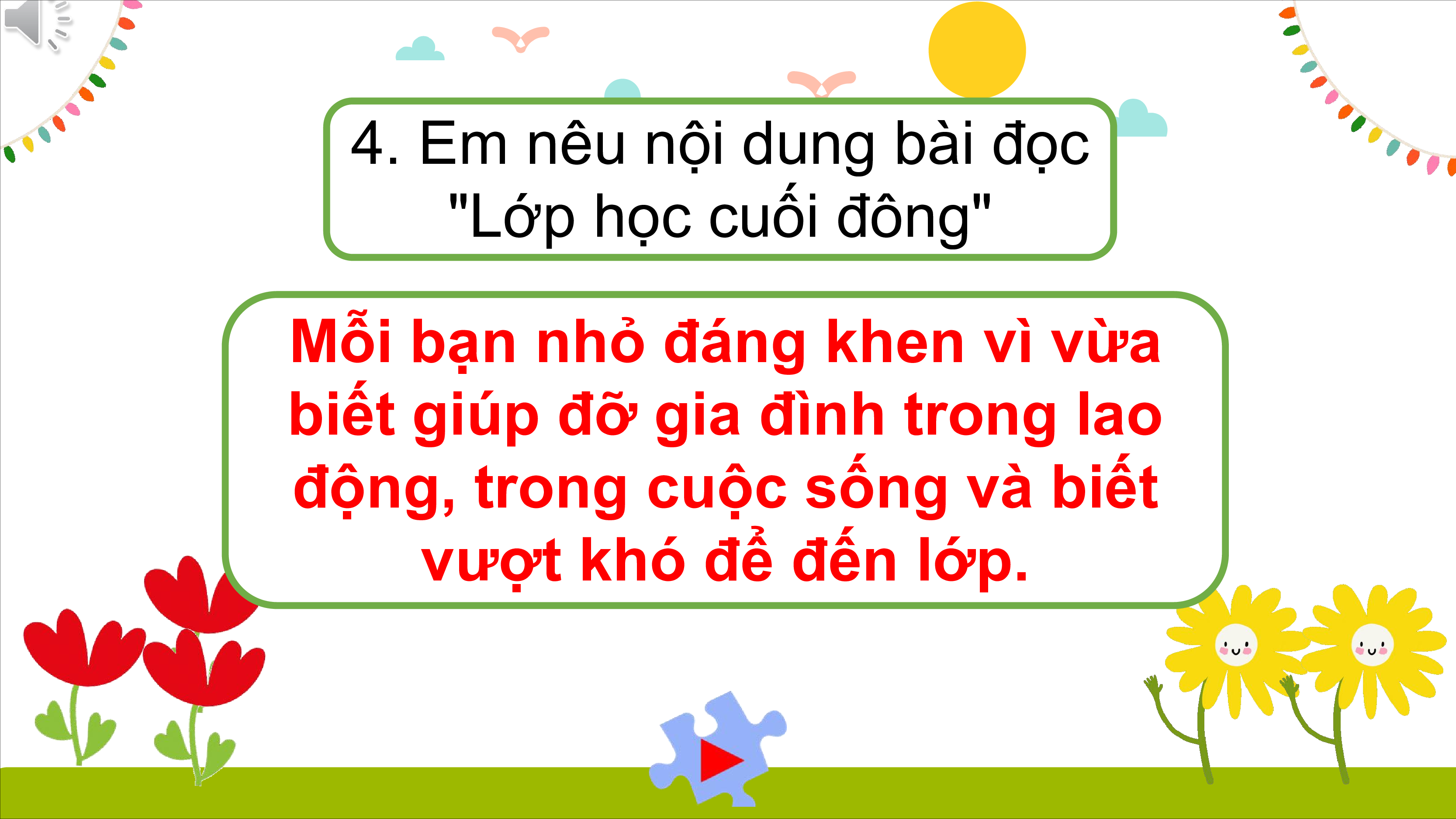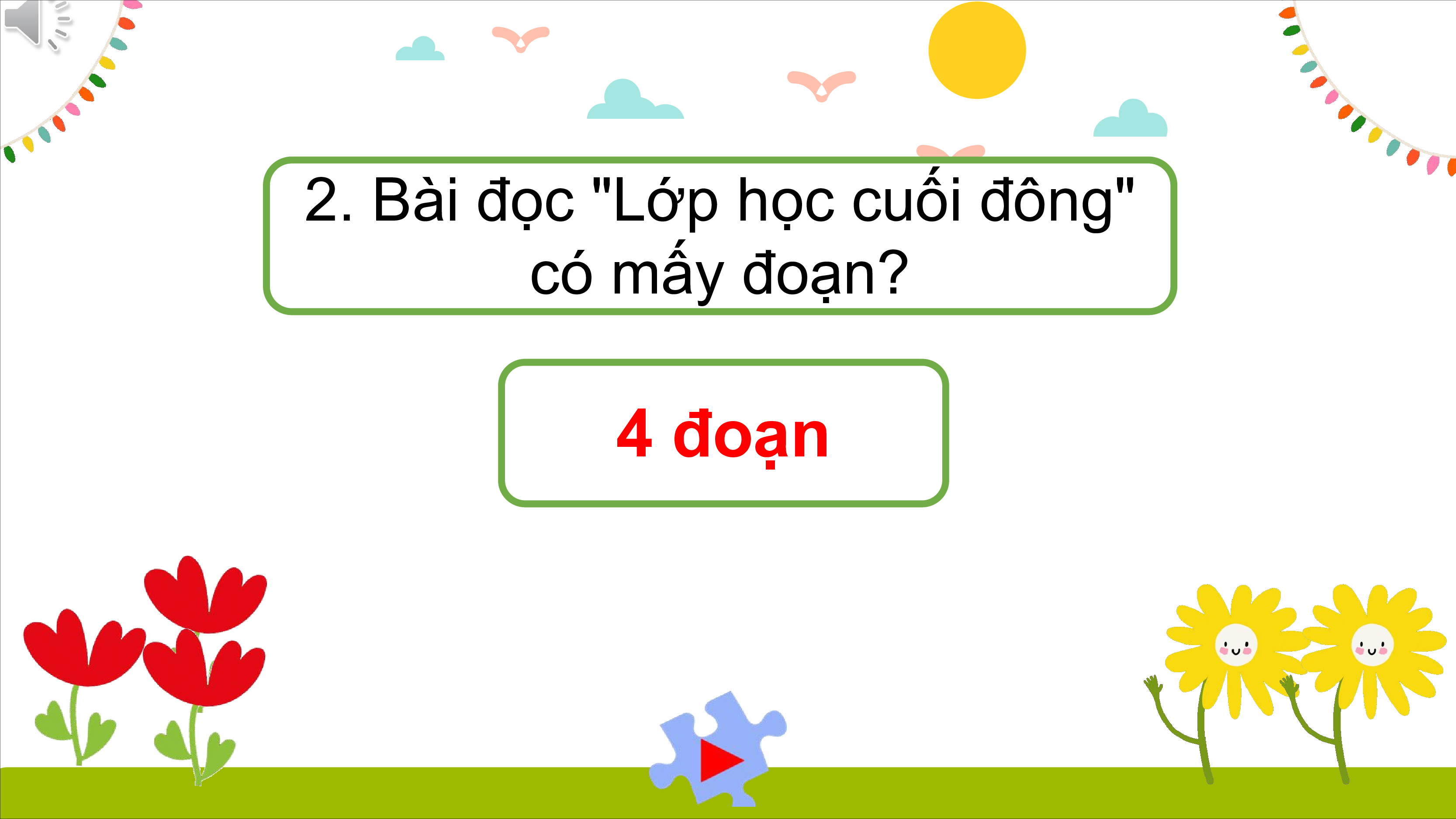 2. Bài đọc "Lớp học cuối đông" có mấy đoạn? 4 đoạn 3. Bạn Súa kể cho thầy giáo nghe về điều gì?