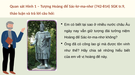 Quan sát Hình 1 – Tượng Hoàng đế Sác-lơ-ma-nhơ (742-814) SGK tr.9,