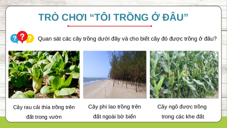 Quan sát các cây trồng dưới đây và cho biết cây đó được trồng ở đâu?