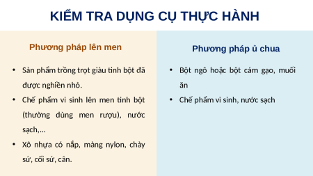 KIỂM TRA DỤNG CỤ THỰC HÀNH Phương pháp lên men