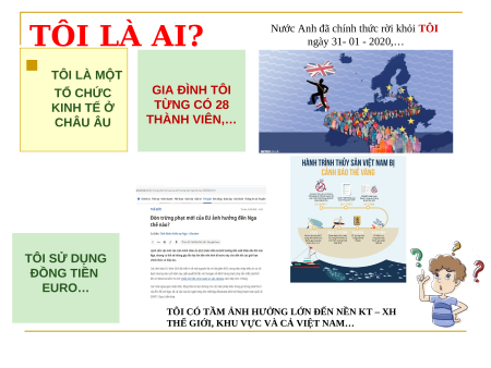 Nước Anh đã chính thức rời khỏi TÔI ngày 31- 01 - 2020,… TÔI LÀ MỘT TỔ CHỨC GIA ĐÌNH TÔI KINH TẾ Ở TỪNG CÓ 28 CHÂU ÂU THÀNH VIÊN,… TÔI SỬ DỤNG ĐỒNG TIỀN EURO…