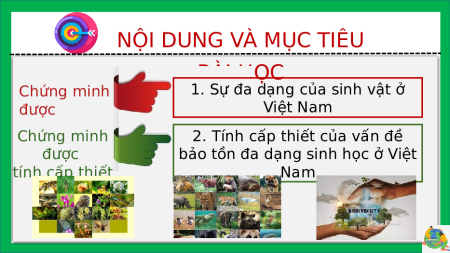ĐỀ BẢO TỒN ĐA DẠNG SINH HỌC Ở VIỆT NAM NỘI DUNG VÀ MỤC TIÊU BÀI HỌC Chứng minh