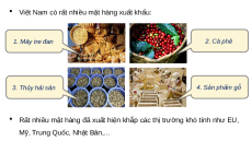 Việt Nam có rất nhiều mặt hàng xuất khẩu: 1. Mây tre đan 2. Cà phê 3. Thủy hải sản 4. Sản phẩm gỗ