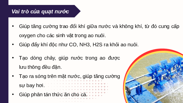 cho biết vai trò của quạt nước đối với môi trường nuôi thủy sản.