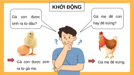 VỚI TIẾT HỌC HÔM NAY! KHỞI ĐỘNG Gà con được Gà mẹ đẻ con sinh ra từ đâu? hay đẻ trứng? Gà con được sinh Gà mẹ đẻ trứng. ra từ gà mẹ. KHỞI ĐỘNG