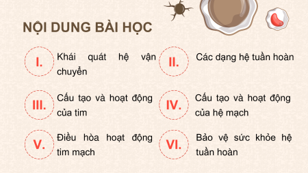 TUẦN HOÀN Ở ĐỘNG VẬT NỘI DUNG BÀI HỌC Khái quát hệ vận Các dạng hệ tuần hoàn chuyển Cấu tạo và hoạt động Cấu tạo và hoạt động của tim của hệ mạch Điều hòa hoạt động Bảo vệ sức khỏe hệ tim mạch tuần hoàn