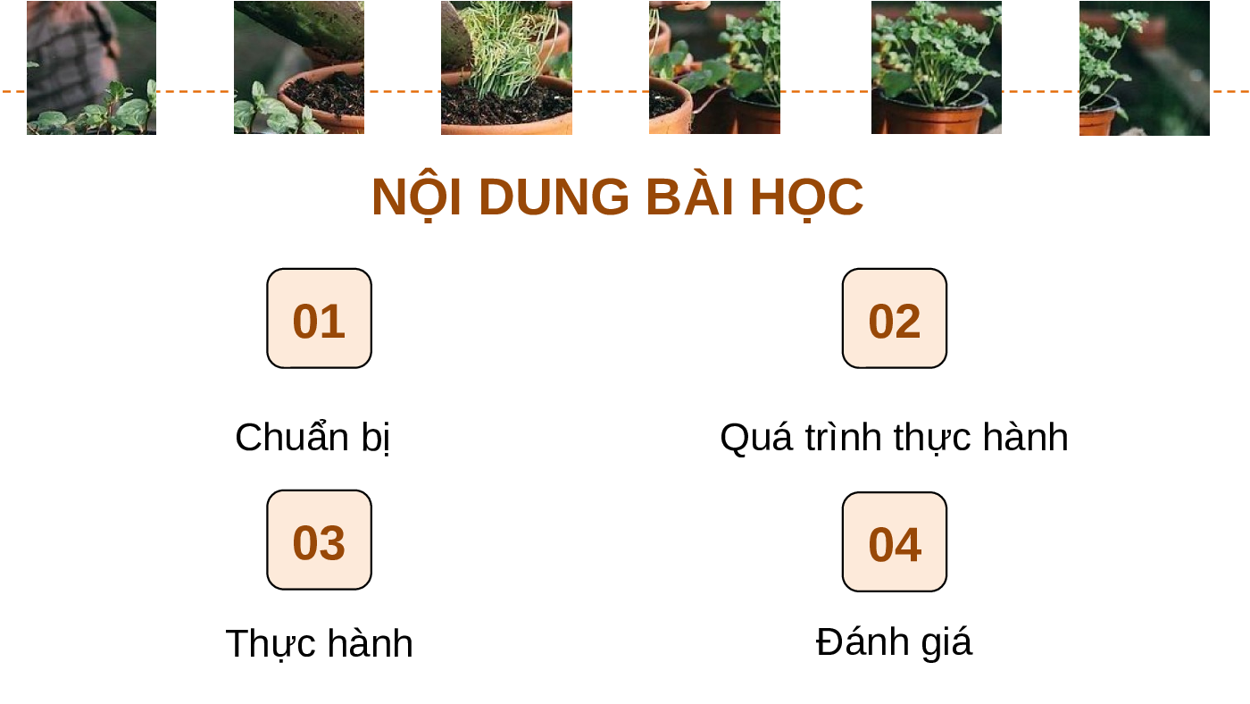BUỔI HỌC NGÀY HÔM NAY! NỘI DUNG BÀI HỌC 01 02 Chuẩn bị Quá trình thực hành 03 04 Thực hành Đánh giá CÔNG NGHỆ 10 BÀI 10