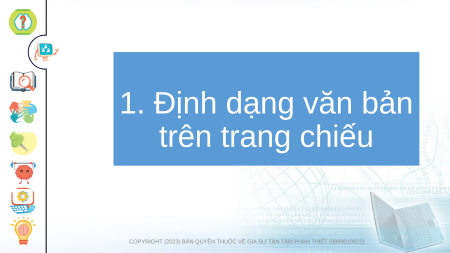 COPYRIGHT (2023) BẢN QUYỀN THUỘC VỀ GIA SƯ TẬN TÂM PHAN THIẾT (0899010822) 1. Định dạng văn bản trên trang chiếu