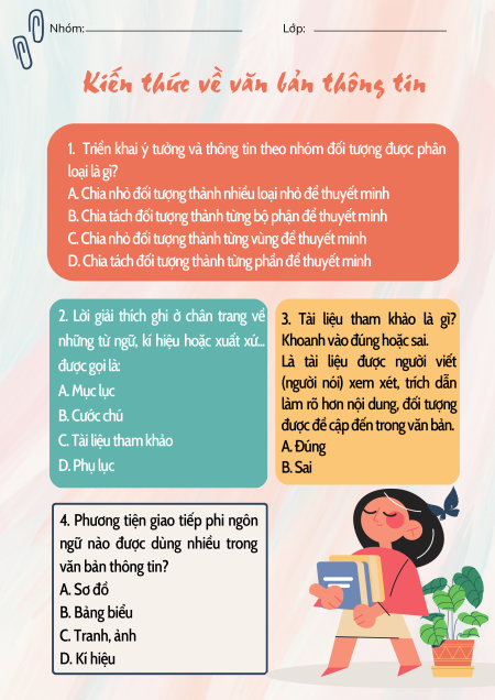 ngữ nào được dùng nhiều trong văn bản thông tin? A. Sơ đồ B. Bảng biểu C. Tranh, ảnh D. Kí hiệu