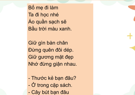 BÀI HÁT TỚI TRƯỜNG - CHỮ HOA H Bố mẹ đi làm Ta đi học nhé Áo quần sạch sẽ Bầu trời màu xanh. Giữ gìn bàn chân Đừng quên đôi dép. Giữ gương mặt đẹp Nhớ đừng giận nhau. - Thước kẻ bạn đâu? - Ở trong cặp sách. - Cây bút bạn đâu