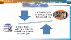 LÀM THẾ NÀO ĐỂ GIÚP CÔ BÉ RẮC RỐI CHỌN LỰA Khởi S đÁCH ộng ? 1. Kể ra những việc em thường làm trong thời gian rảnh rỗi? 2. Em có thích đọc sách? Kể ra ít nhất 05 cuốn sách / truyện mà em đã đọc qua? Tình huống 1: