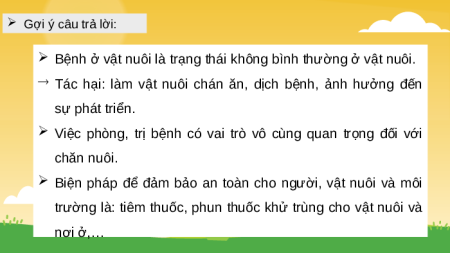 trường là: tiêm thuốc, phun thuốc khử trùng cho vật nuôi và nơi ở,… BÀI 11: VAI TRÒ CỦA PHÒNG, TRỊ BỆNH TRONG CHĂN NUÔI