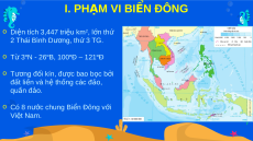 Ị LÍ 8 – CÁNH DI U Ề CHƯƠNG 4: BIỂN ĐẢO VI T Ệ NAM GV: TRẦN HÀ BÀI 11: PHẠM VI BI N ĐÔNG Ể CÁC VÙNG BI N Ể C A Ủ VI T Ệ NAM Ở BI N Ể ĐÔNG ĐẶC ĐI M Ể T NHI Ự ÊN VÙNG BI N Ể ĐẢO VI T NAM Ệ M C Ụ TIÊU BÀI H C Ọ Xác đ n ị h đư c ợ trên b n ả đ ồ ph m ạ vi Bi n ể Đông, các nư c ớ và vùng lãnh th ổ có chung Bi n ể Đông v i ớ Vi t ệ Nam. Trình bày đư c ợ đ c ặ đi m ể t ự nhiên vùng bi n ể đ o ả Vi t ệ Nam. Xác đ n ị h được trên b n ả đ ồ các m c ố xác đ n ị h đư n ờ g c ơ s , ở đường phân chia v n ị h B c ắ B ộ gi a ữ Vi t ệ Nam và Trung Qu c ố ; trình bày đư c ợ các khái ni m ệ vùng n i ộ th y ủ , lãnh h i ả , ti p ế giáp lãnh h i ả , vùng đ c ặ quy n ề kinh t , ế th m ề l c ụ đ a ị của Việt Nam (theo Lu t ậ Bi n ể Vi t ệ Nam). I. PHẠM VI BI N Ể ĐÔNG o Diện tích 3,447 tri u ệ km2, l n ớ th ứ 2 Thái Bình Dư n ơ g, th ứ 3 TG.