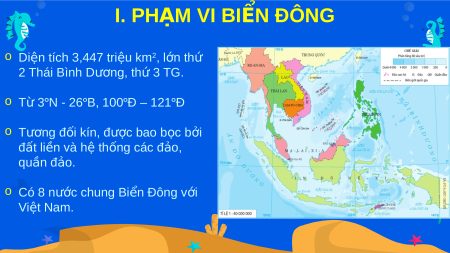 o Từ 3°N - 26°B, 100°Đ – 121°Đ o Tương đ i ố kín, được bao b c ọ b i ở đất li n ề và hệ th n ố g các đ o ả , qu n ầ đ o ả . o Có 8 nước chung Bi n ể Đông v i ớ Vi t ệ Nam.