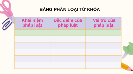 BẢNG PHÂN LOẠI TỪ KHÓA Khái niệm Đặc điểm của Vai trò của pháp luật pháp luật pháp luật