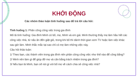 3/ Nếu bạn là Minh, bạn sẽ nói gì với bố mẹ về cách chia sẻ công việc nhà? KHỞI ĐỘNG