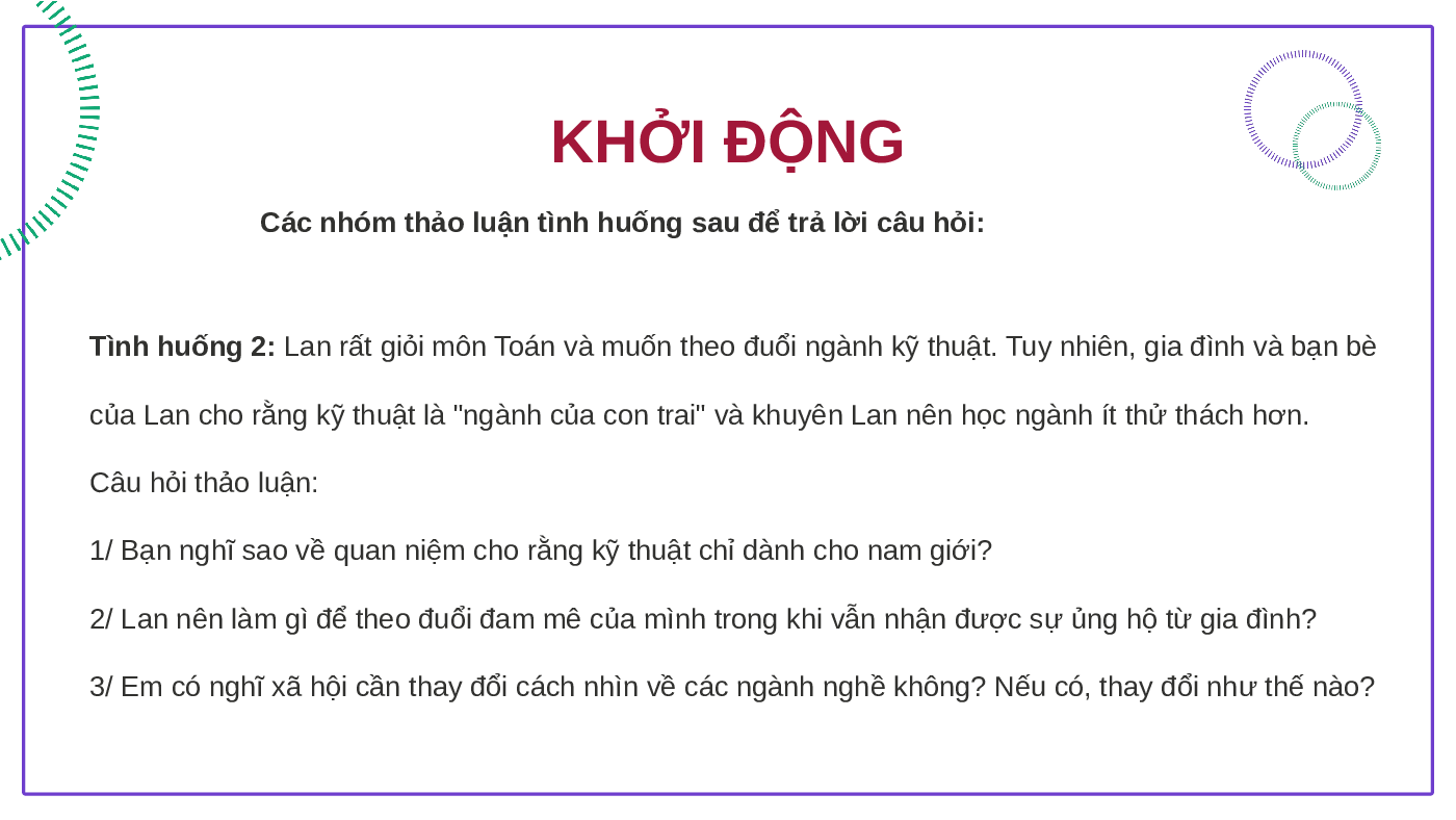 Tình huống 2: Lan rất giỏi môn Toán và muốn theo đuổi ngành kỹ thuật. Tuy nhiên, gia đình và bạn bè
