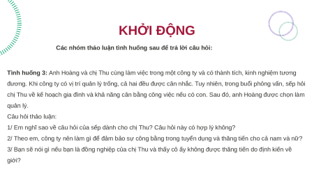 chị Thu về kế hoạch gia đình và khả năng cân bằng công việc nếu có con. Sau đó, anh Hoàng được chọn làm quản lý. Câu hỏi thảo luận:
