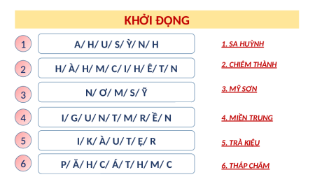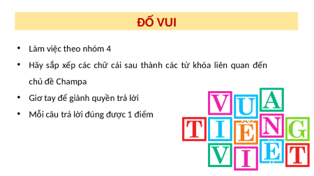 • Hãy sắp xếp các chữ cái sau thành các từ khóa liên quan đến chủ đề Champa