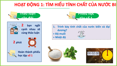 HOẠT ĐỘNG 1: TÌM HIỂU TÍNH CHẤT CỦA NƯỚC BIỂN VÀ ĐẠI DƯƠNG Thảo luận Phiếu học cặp đôi tập số 1 2 bạn ngồi
