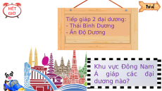 - Về đích: trả lời đúng 100% câu hỏi Vị trí Sông Khí Sinh Khoáng Dân cư địa lí hồ hậu vật sản CHÚC MỪNG 1 2 Bài mới STA RT 9 8 7 6 5 4 3 2 1 HẾT GIỜ Tiếp giáp 2 đại dương: - Thái Bình Dương - Ấn Độ Dương Khu vực Đông Nam Á giáp các đại dương nào?