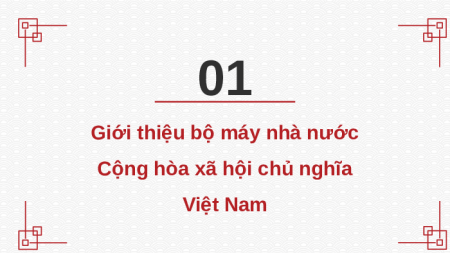 XÃ HỘI CHỦ NGHĨA VIỆT NAM NỘI DUNG BÀI HỌC 01 02 03 Giới thiệu bộ máy nhà Quốc hội nước Chủ tịch nước nước Cộng hoà xã hội Cộng hoà xã hội Cộng hoà xã hội chủ nghĩa Việt Nam chủ nghĩa Việt Nam chủ nghĩa Việt Nam 04 05 06 Chính phủ nước Tòa án nhân dân Phê phán, đấu tranh Cộng hoà xã hội và Viện kiểm sát với những hành vi chủ nghĩa Việt Nam nhân dân chống phá nhà nước