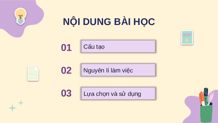 BÀI 12: NỒI CƠM ĐIỆN NỘI DUNG BÀI HỌC 01 Cấu tạo 02 Nguyên lí làm việc 03 Lựa chọn và sử dụng