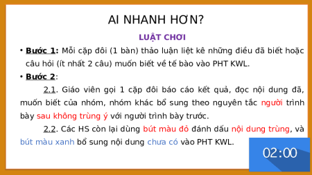 câu hỏi (ít nhất 2 câu) muốn biết về tế bào vào PHT KWL. • Bước 2: